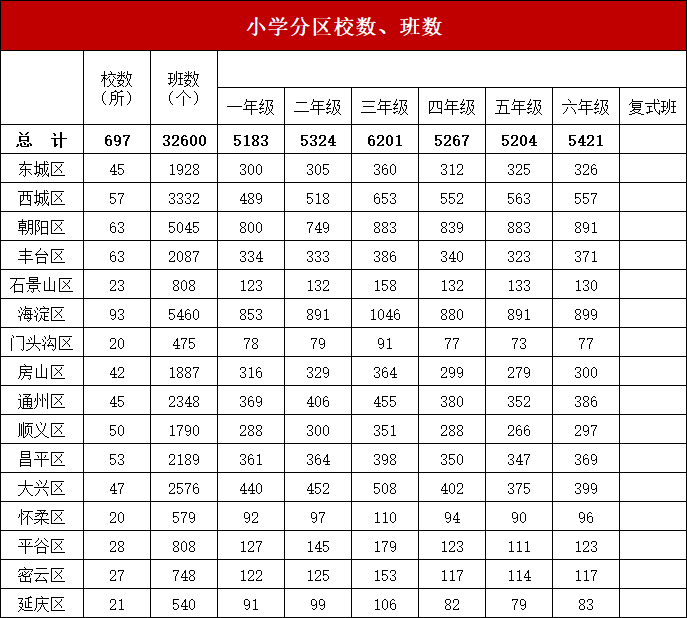北京市小学分区校数、班数