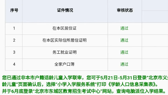 非京籍和按京籍对待一般审核时间会相对较长,且由于家长在信息采集系统上可以查询到四证各材料审核进度,家长请实时关注信息采集系统,如出现材料审核不通过的情况,抓紧根据城区要求看是否能重新填报,以东城区非京籍信息采集系统为例,家长可看在京务工就业证明、在京实际居住证明、全家户口簿、北京居住证各材料显示是否通过: