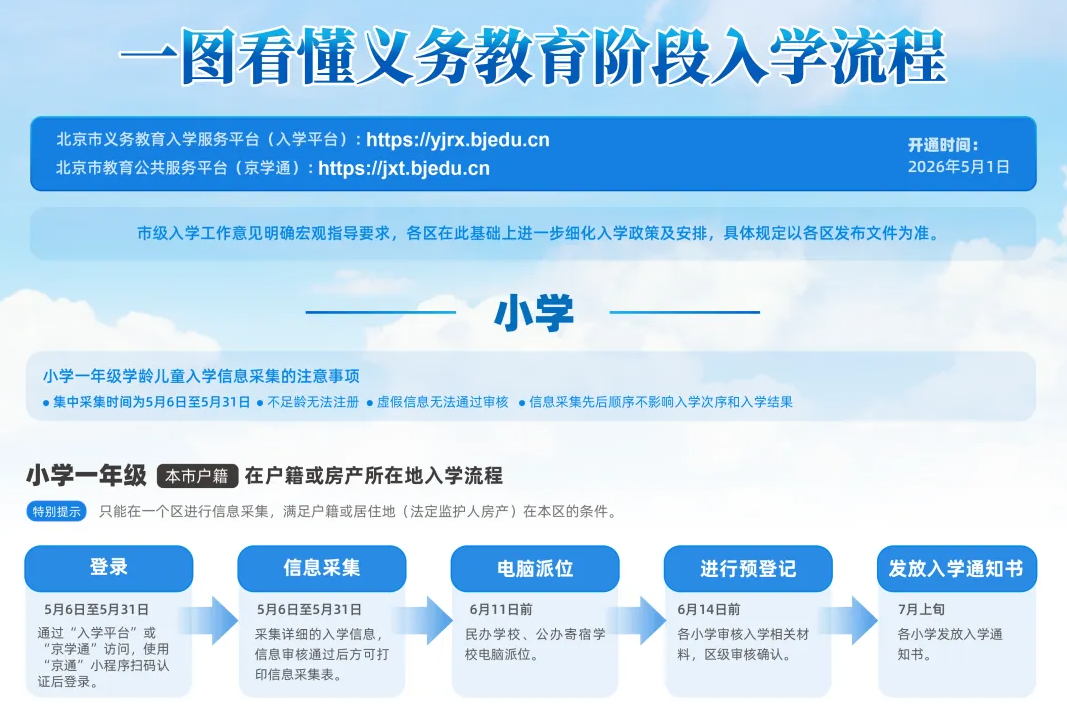 北京市幼升小信息采集系统5月1日开放!5月6日-5月31日之间注册填报,报名入口:2026年北京16区信息采集系统入口:京籍非京籍义务教育入学服务平台注册报名操作手册、填报注意事项等