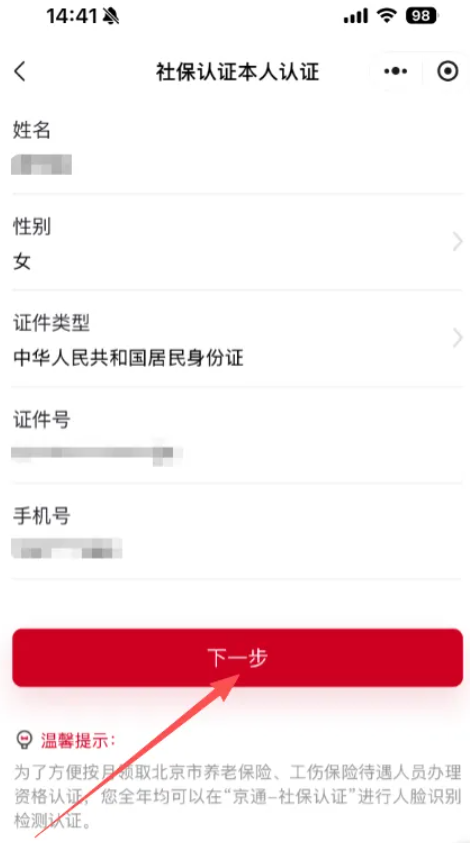 1.退休人员本人登录“京通”小程序的,选择“本人社保认证”,这一步会自动带出退休人员本人信息,直接点击【下一步】即可进行认证,手机号默认为“京通”注册手机号,不可修改。请核实手机号是否正确,如需更换手机号,可以在“我的”—设置(右上角螺母图标)更换手机号码;