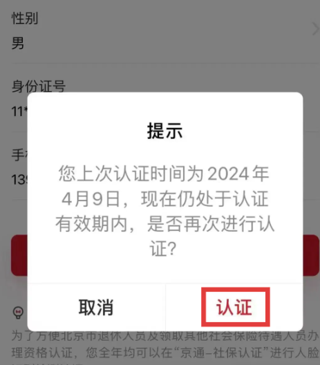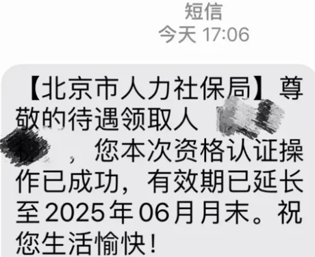 4.再点击“认证”,认证成功后会收到北京市人力社保局资格认证操作成功的短信。