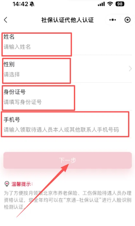 2.进入京通小程序首页,点击右上角小人图标,进入老年人服务专区,本人认证点击下方本人社保认证,核对姓名、证件号及联系方式,点击下一步,按提示操作。非本人认证点击他人社保认证,输入认证人的姓名、性别、身份证号及手机号,点击下一步,后续按照提示进行操作。