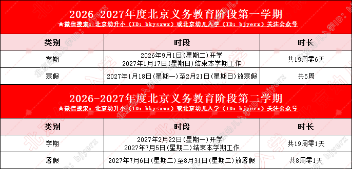 北京市教委此前正式公布2026-2027学年度校历,不仅明确了寒暑假放假时间,教学安排也同步出炉。当下,不少学生和家长都十分关心,北京市中小学生2026年、2027年暑假时长究竟是变长了还是缩短了?本文将为您详细整理对比。