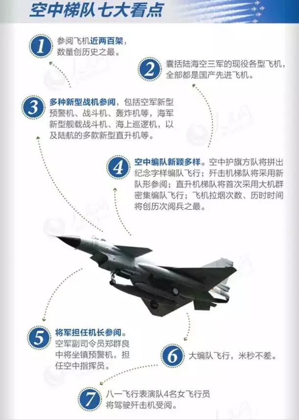 阅兵的空中梯队将带来一场视觉盛宴,此次阅兵空中梯队规模超过历次,多型飞机均为列装后首次参阅,全部都是国产先进武器装备,空军一些明星机型都会亮相。据了解,此次参与阅兵的飞机将从北京周边的8个机场进行起降。最先出场是空中护旗方队,由直升机编成,他们护卫着国旗和军旗飞过天安门。