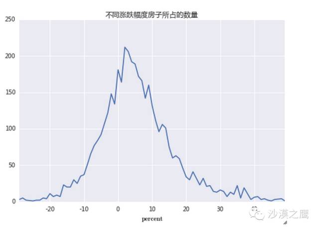 我们按照2014和2015年价格增减的百分比,绘制出下面的房价变化数量比例图。可以看到,房价变化基本呈现正态分布趋势。但均值不在0点,靠近5%左右,整体右移: