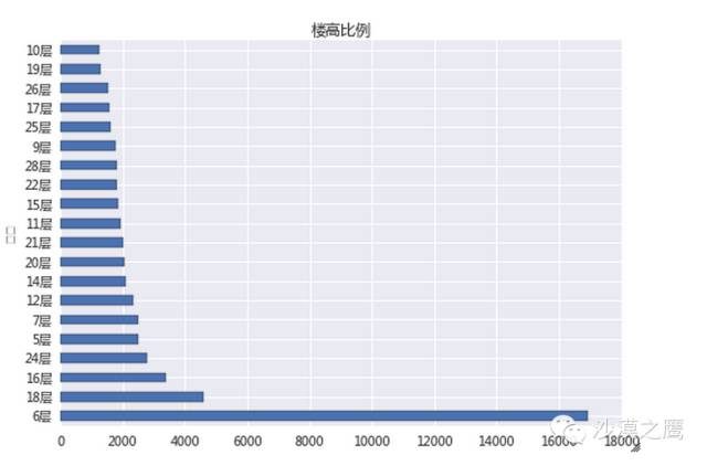我们先看,什么类型的楼房最多,下面给出了楼房总体高度的比例。可以看到,二手房中,六层的筒子楼是最多的。国家规定,七层就要装电梯了。因此在2000年以前,大部分的居民楼都是6层。