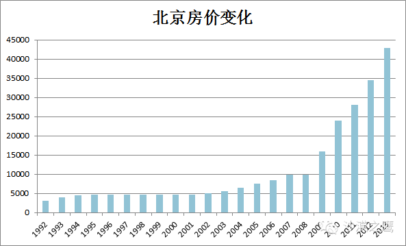可以看到,1992年到2002年,呈现一个非常稳定的状态。从2008年起,北京的房价如同火箭一般上窜。
