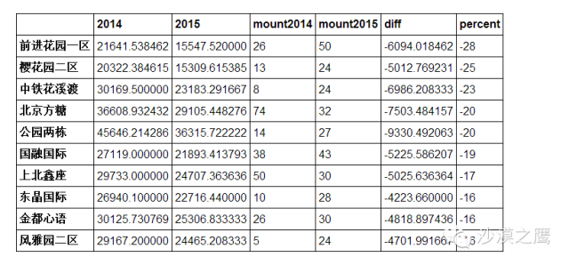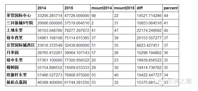 我们列出10万元以下单价,2015年小区内二手房数量超过20套的涨价排名前十的小区: