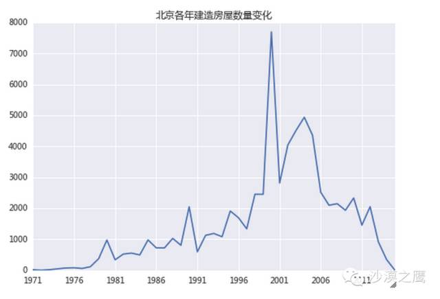 有意思的是,如果按照建造时间来绘制图表,会发现在2000年和2004年左右,达到高峰。在6W套二手房中,2000年总 造了7697套,占比百分之11.21%。