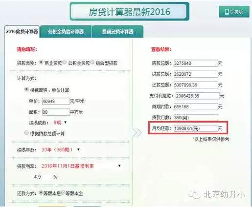 就目前来看,全额付款买房的较少,一般是贷款,那么,房子以80㎡计算,贷款30年的话,按揭付2成,分360期还清,按照现在贷款利率4.9%计算,每月需还房贷13908.61元!