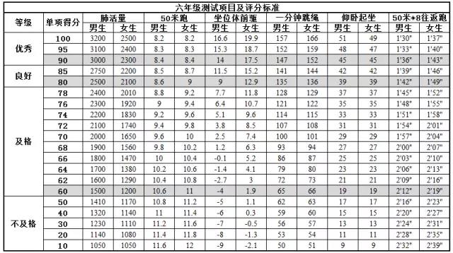 2019年北京小学六年级体测项目及评价标准