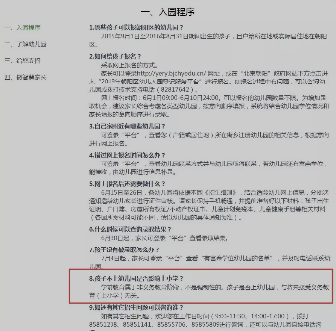 朝阳区幼儿园入园登记问答上明确说幼儿是否上幼儿园与将来接收义务教育无关,具体如下图所示: