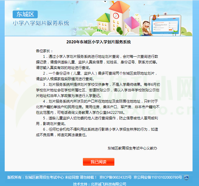 温馨提示:关于东城区小学划片查询系统详细操作流程,家长可参考:2020年东城区小学划片查询详细操作流程