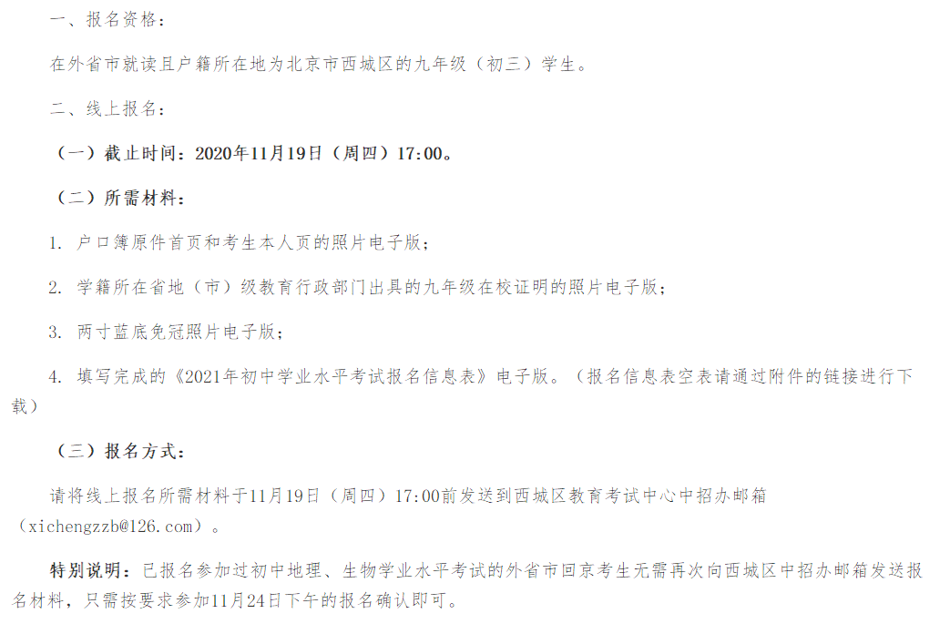 西城区户籍九年级(初三)外省市回京考生报名参加2021年初中学业水平 的通知