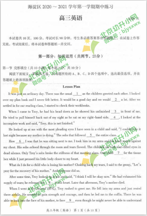 2021年海淀区高三期中 英语试卷如下所示,北京幼升小网团队为您分享2020-2021学年第一学期海淀区高三期中 英语试题。