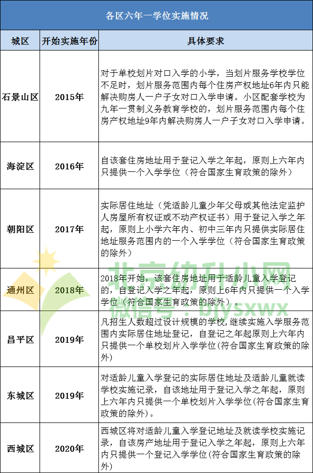 目前,北京实行六年一学位政策的城区有:东城区、西城区、海淀区、朝阳区、通州区、石景山区、昌平区部分小学,具体如下图所示:
