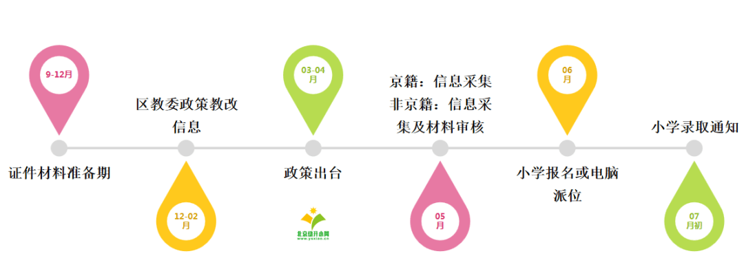 - 非京籍:信息采集——材料审核——小学报名/派位入学——录取;