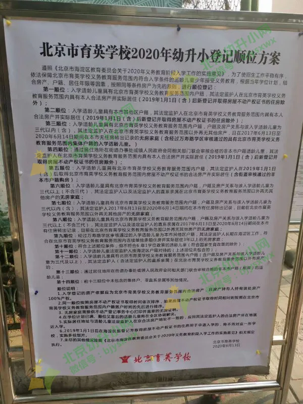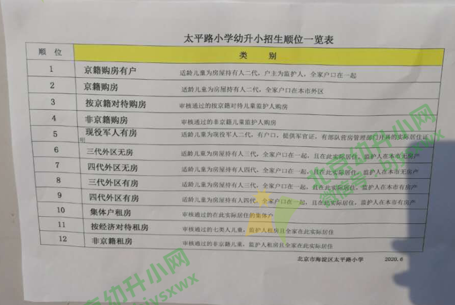 提醒:从海淀区2020年幼升小入学情况来看,在海淀区有户口及房产的顺位比较靠前,三代在外区无房比有房顺位优先,各小学顺位或将有所差异,具体请以小学实际要求为准!