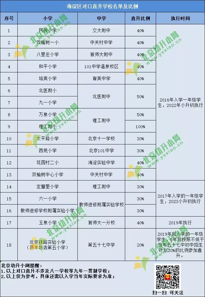 此外,海淀区对口直升学校直升比例也在逐年增加,海淀区根据信息共汇总有18个对口直升学校名单,如下图所示: