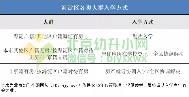 参考2020年入学情况来看,海淀区有房无房差别大,各类人群入学方式有如下几种情况: