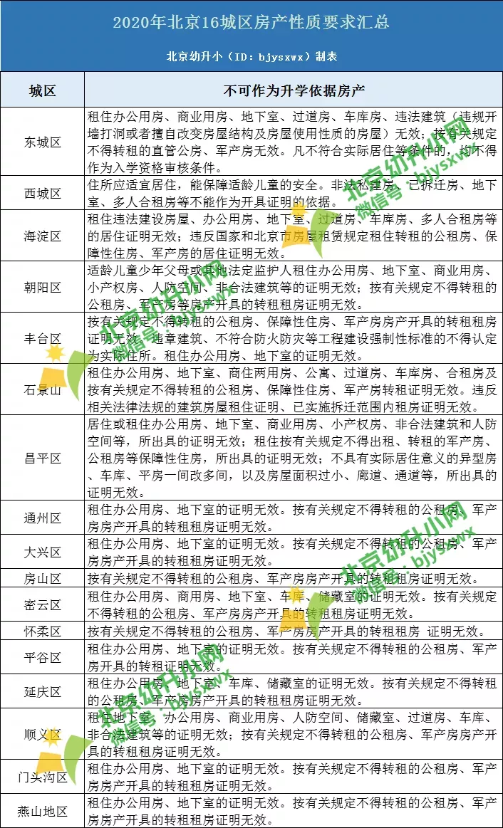从目前北京幼升小入学政策来看,正规的住宅性质房产可作为入学依据,而各区不能作为入学依据房产要求不同,为此梳理了2020年政策中的相关内容,供各位家长了解。