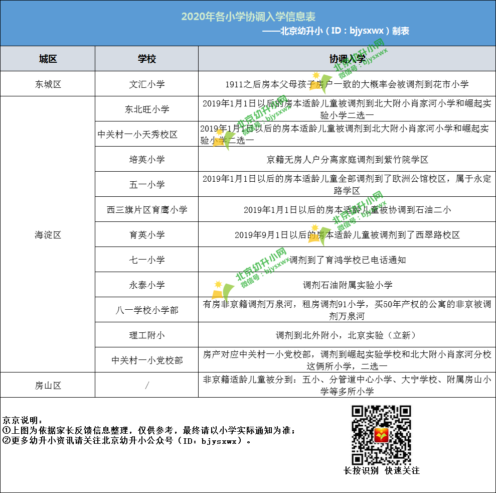 2、从以上2020年部分小学协调入学情况来看,购房新政对孩子入学有相关影响,部分小学购房新政后房本入学被协调,目前6个城区实行购房新政(如海淀1911、东城630等),建议大家提前了解入学城区要求,提早准备,各位家长可以点击左下角阅读原文,获取入学城区购房新政相关信息。