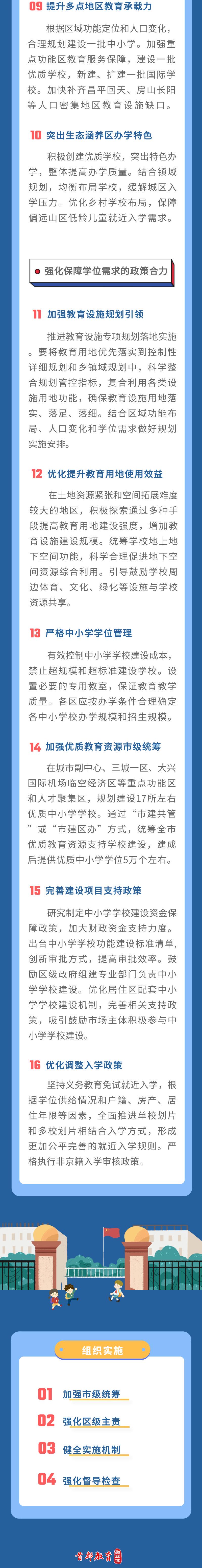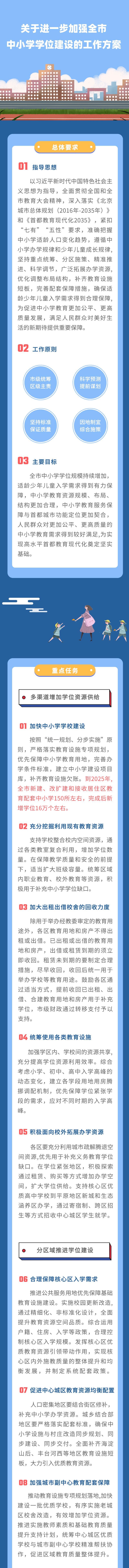 为进一步推进解决中小学学位供给问题,有效保障群众“学有所教”,北京市教育委员会等六部门印发《关于进一步加强全市中小学学位建设的工作方案》。《方案》指出,到2025年,全市新建、改扩建和接收居住区教育配套中小学150所左右,完成后新增学位16万个左右。