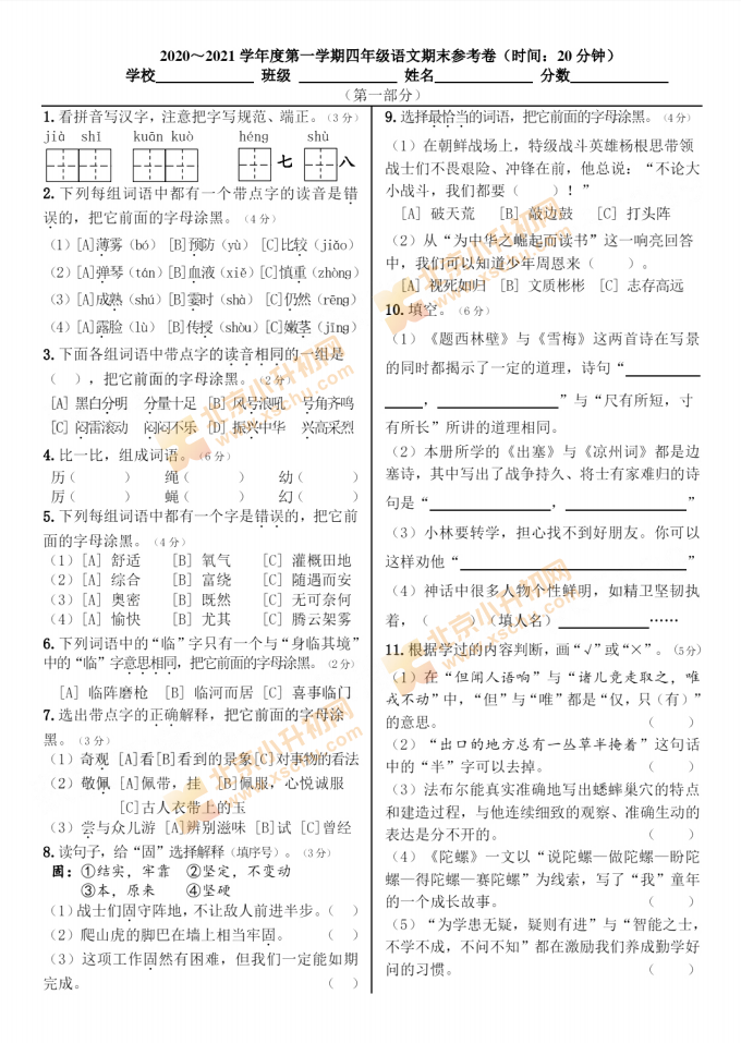 顺义区2020-2021学年度第一学期四年级语文期末 卷