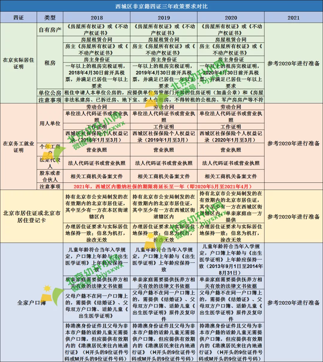 西城区2021年社保要求已明确延长至一年,建议2021及之后非京籍升学家长,从严准备,其他方面的要求西城区较为稳定,具体可参考上图,最终请以入学当年政策为准。