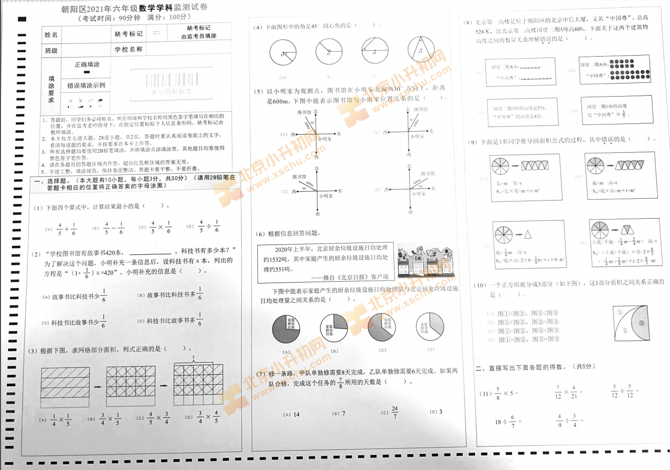 2021年朝阳区六年级数学期末 试卷出炉,快来看看2021年朝阳区六年级数学期末 考了什么内容。
