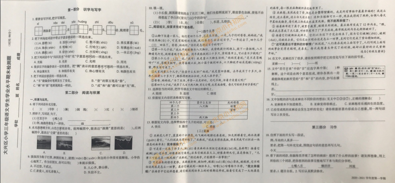 2020-2021学年第一学期大兴区小学3年级期末 语文试题出炉,快来看看2021年大兴区小学三年级语文期末 考了什么内容。