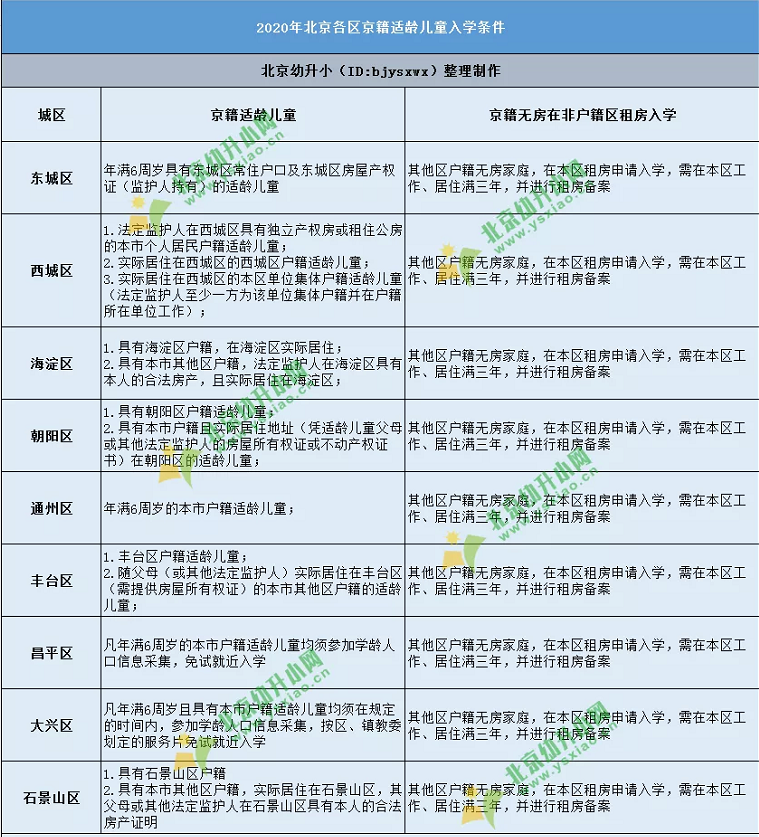 不管是京籍适龄儿童还是非京籍适龄儿童,如果想跨区入学,需要满足目标入学城区幼升小条件,准备相关证明材料,审核通过后入学。目前2021年入学政策暂未出台,整理2020年各区入学要求,大家可以参考准备,最终请以入学当年实际要求为准。