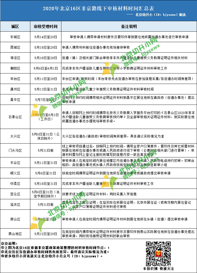 从近两年北京幼升小来看,非京籍审核一般在五月进行(线上审核和线下审核),我们整理了2020年各区非京籍幼升小材料审核时间,如下图所示,2021年非京籍幼升小家长可以参考: