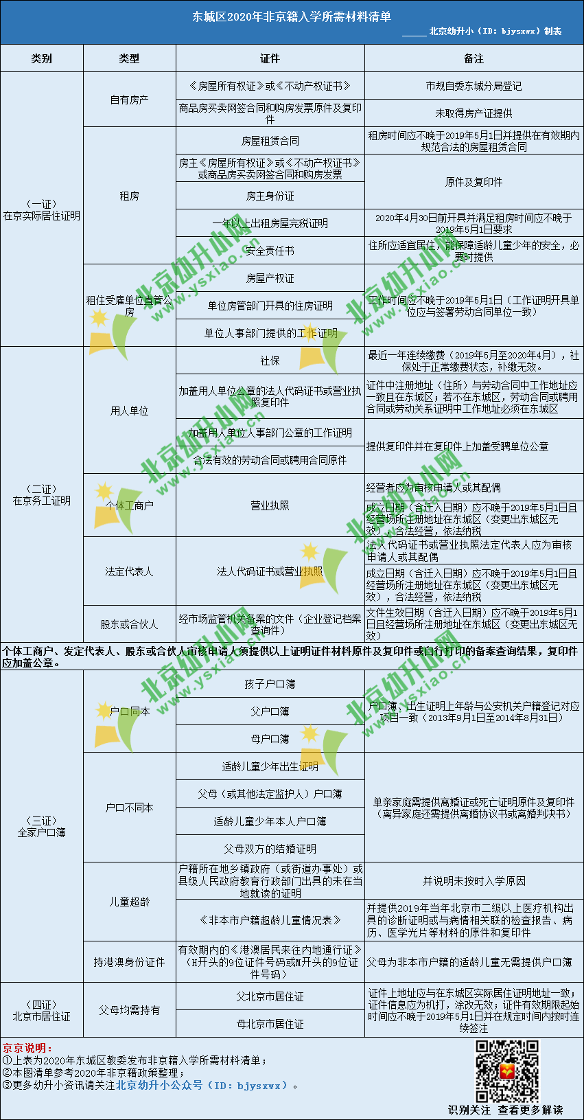 2020年东城区非京籍需提供四证材料入学,详细材料要求如下图所示: