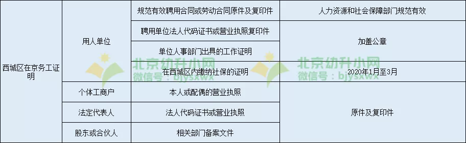 申请人及其配偶均需提供在京务工就业证明,且一方在西城区务工就业,并符合下列条件之一: