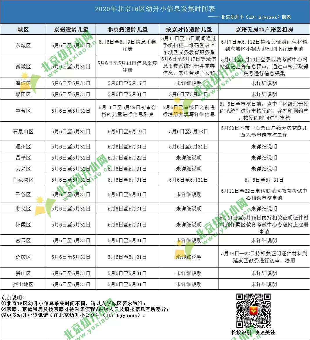 从近两年北京市义务教育入学时间安排来看,幼升小信息采集时间一般集中在5月份,2020年是5月1日网站对外开放,5月6日至31日为信息采集时间。京京整理2020年各区信息采集时间如下图所示,大家可以参考,最终请以入学当年实际要求为准: