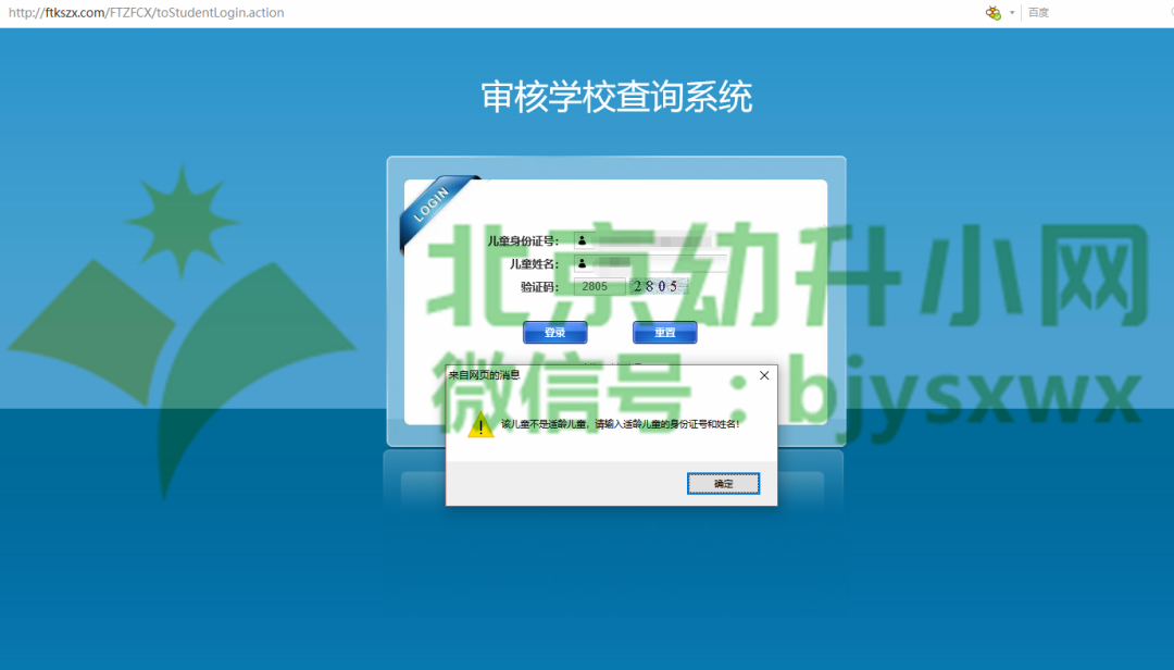 4、丰台区小学划片查询系统需提交适龄儿童身份证号码,如儿童不是适龄儿童不能登录该系统,提示如下: