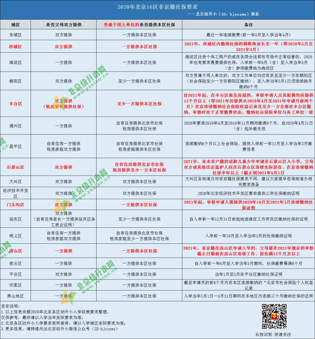 参照2020年非京籍幼升小入学政策,北京16区关于社保提供时间及要求有所不同,2021年幼升小入学家长,可参考借鉴提前了解,京京整理了各区非京籍社保要求,如下图所示: