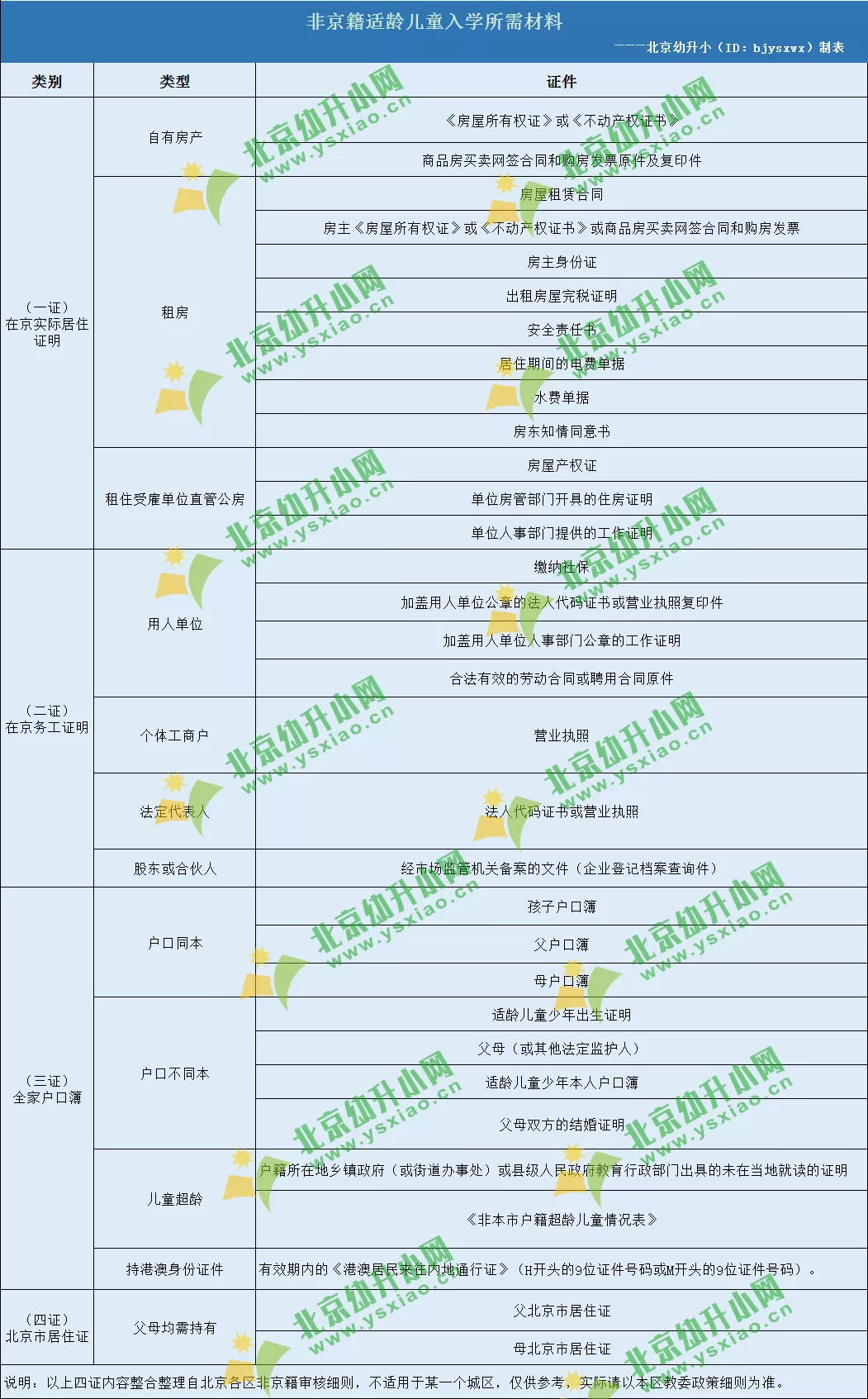 1、非京籍四证包含大大小小十几个证件,需要各位家长按照入学城区要求,抓紧准备!入学材料筹备齐全和准确,是孩子能否顺利入学的关键一步,各位家长可参考往年要求赶紧核对,以免耽误孩子升学;