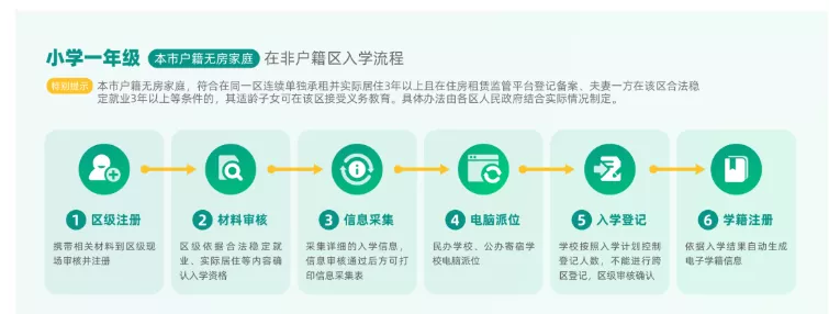 京籍无房在非户籍区租房入学家庭入学方式一般为多校划片入学,建议家长们可以查看入学城区要求对照孩子入学方式。