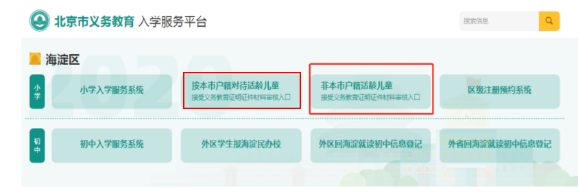 温馨提示:上图为2020年海淀区信息采集入口,大家可看到,有“按本市户籍对待适龄儿童”入口,持北京工作居住证入学家长可选择该入口为孩子办理入学。
