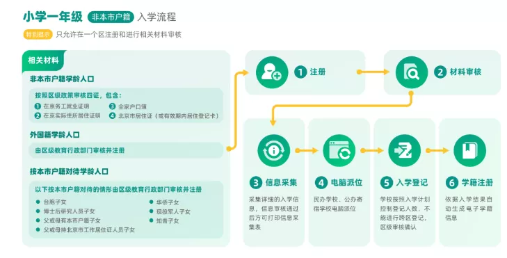 参考2020年非京籍适龄儿童入学流程来看,如下所示: