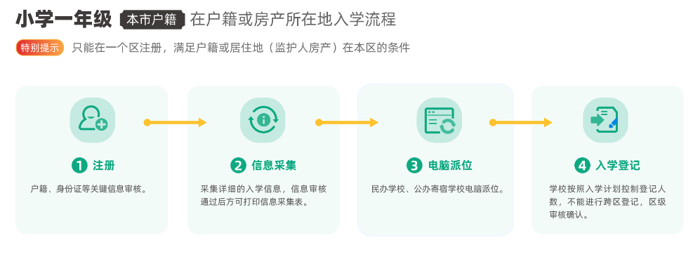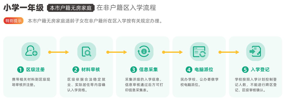 提醒:京籍入学流程一般为先进行信息采集,再进行小学报名或派位入学,审核通过后生成学籍。京籍无房在非户籍区租房入学:入学一般需先前往所在区进行材料审核,审核后进行信息采集注册,建议大家可查看各区政策要求,在规定时间内前往指定地点进行材料审核及信息采集。