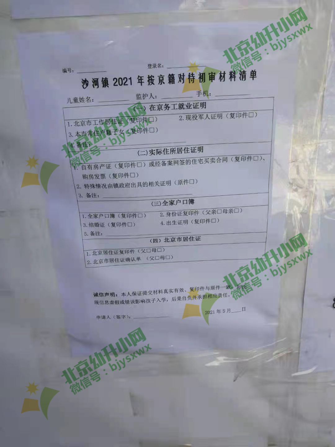 2021年昌平区沙河镇按照京籍对待初审材料清单