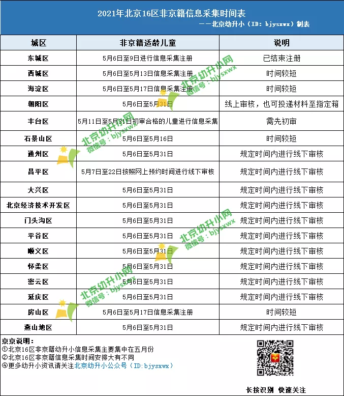 2021年北京各区各类适龄儿童信息采集时间不同,京籍一般为5月6日至5月31日,非京籍和其他类型家长采集时间有所差异,京京整理了北京各区非京籍信息采集时间,供各位家长参考。