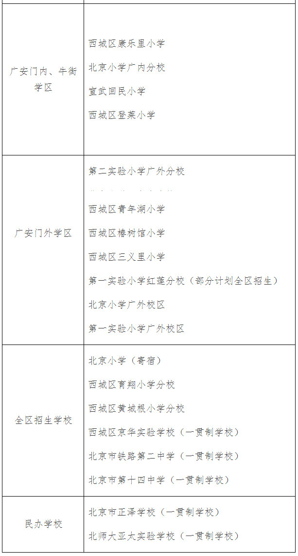 提醒:备受家长们关注的2021年西城区面向全区招生的学校有:西城区育翔小学分校、西城区黄城根小学分校、北京第一实验小学红莲分校(部分计划全区招生)、北京市育才学校(一贯制学校、部分计划全区招生)、西城区京华实验学校(一贯制学校)、北京市铁路第二中学(一贯制学校)、北京市第十四中学(一贯制学校)。