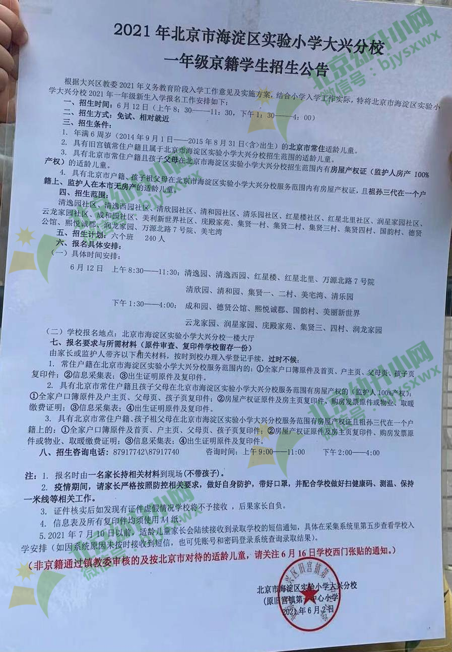 2021年海淀区实验小学大兴分校招生简章