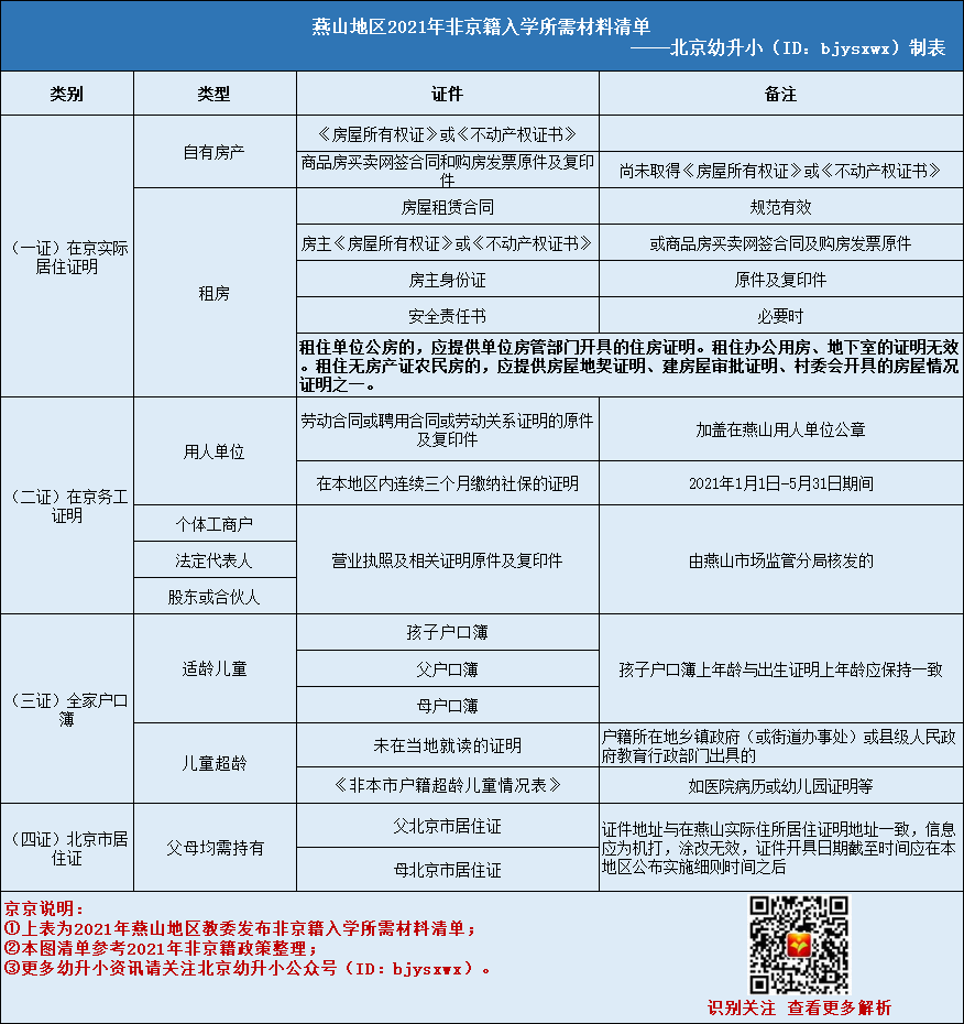 2022年燕山地区非京籍幼升小四证材料清单说明