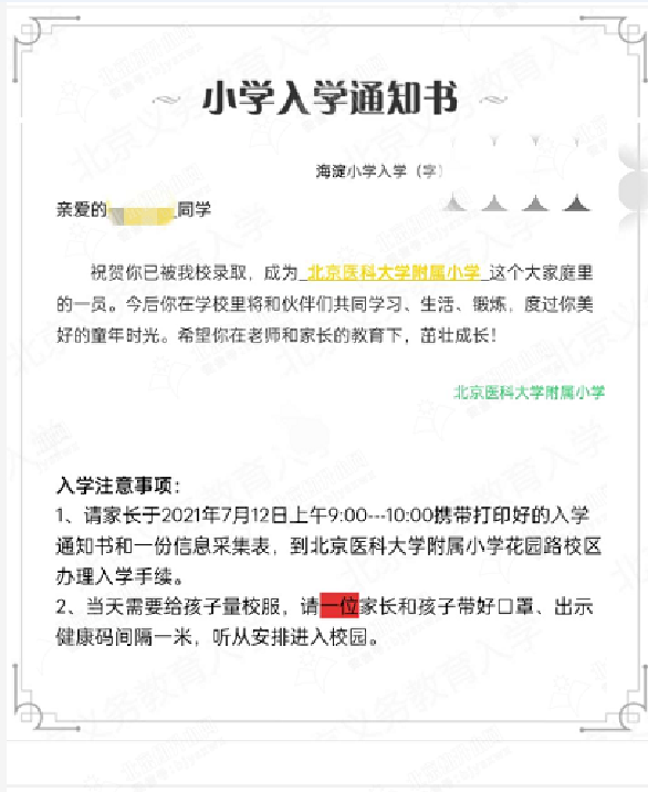 2021年海淀区北京医科大学附属小学录取通知书公布!海淀区2021年小学录取通知陆续下发!各位家长您知道2021年海淀区北京医科大学附属小学录取通知书上有哪些信息?北京幼升小网团队为您分享相关内容。
