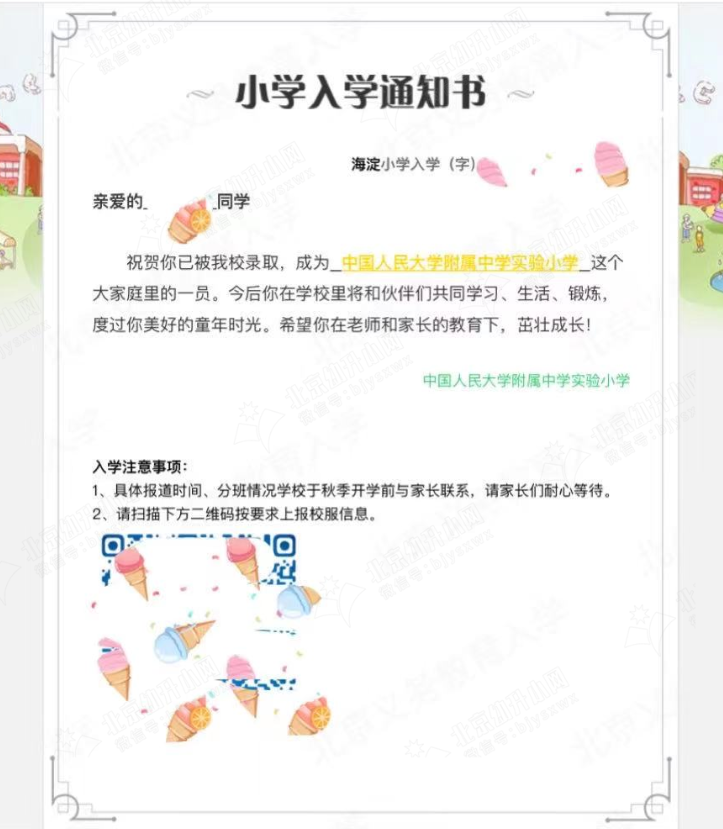 2021年海淀区中国人民大学附属中学实验小学录取通知书